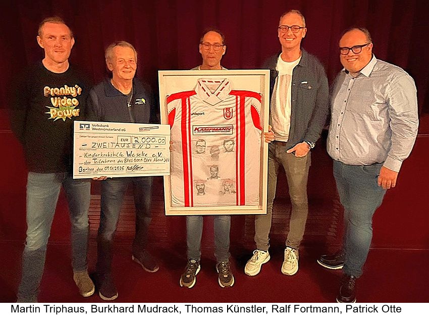 Der Freundeskreis „Borkener Jungs“ hat nach 25 Jahren den Kultfilm „Bang Boom Bang“ vor rund 300 Gästen nochmals im Kino 1 aufgeführt. Sechs Euro pro Karte gingen an die Kinderkrebshilfe Weseke, großzügig aufgerundet standen 2.000,- Euro auf dem Scheck.